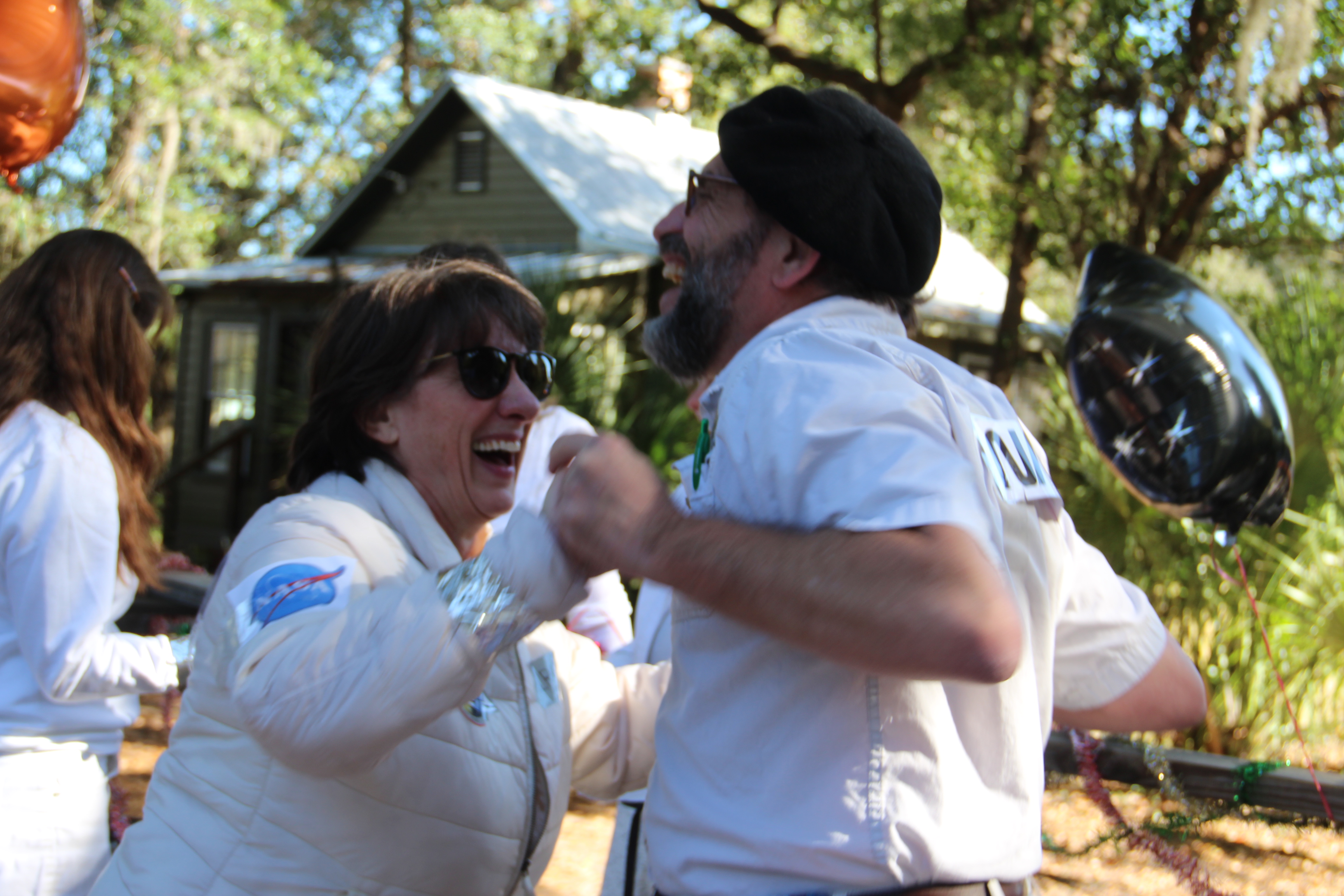 Fearless dancers donned astronaut helmets [a big hit with the crowd!], cheerfully allemanding with obstructed vision --and CO2 buildup. Happy/relieved Organizer and Caller high-fived, after passing the Judges Stand, as everything had worked.   A brief swing-dance spontaneously occurred.